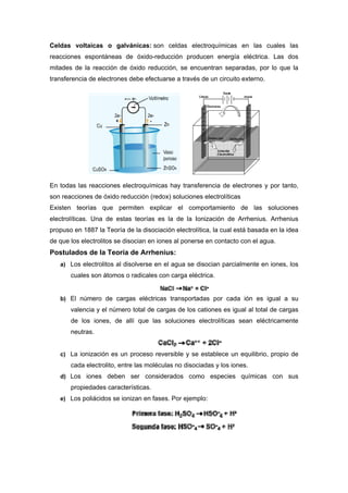 La electroquímica estudia las reacciones químicas causadas por corrientes eléctricas y la generación de electricidad a través de reacciones químicas. Se divide en electrólisis, que implica reacciones causadas por corrientes eléctricas, y celdas galvánicas, que generan corriente eléctrica a través de reacciones espontáneas. Las leyes de Faraday establecen que la masa de un producto de una reacción electroquímica es proporcional a la cantidad de electricidad que pas