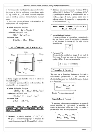 El documento trata sobre electroquímica. Explica que la electroquímica estudia la conversión entre energía eléctrica y química mediante reacciones redox. Describe los procesos electroquímicos como electrolíticos y galvánicos. Define los componentes de una celda electrolítica como el electrolito, electrodos y fuente de corriente. Presenta ejemplos de electrólisis como la del cloruro de sodio fundido y agua acidulada.