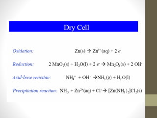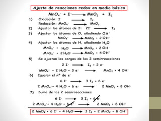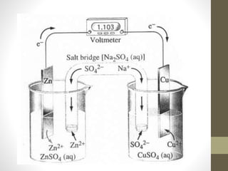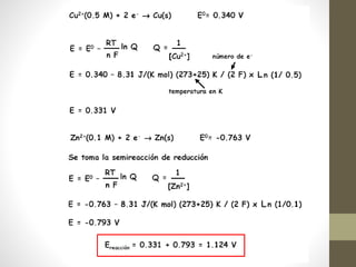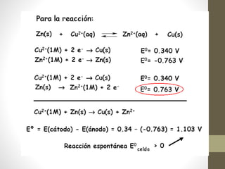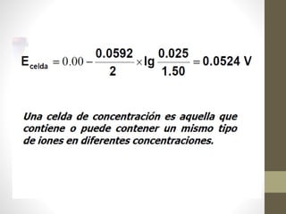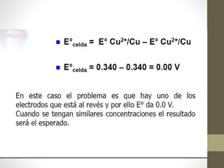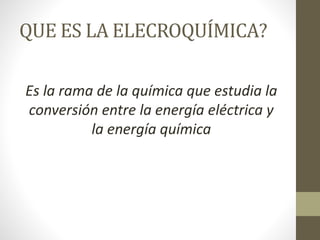Este documento trata sobre electroquímica. Explica que la electroquímica estudia la conversión entre energía eléctrica y química. Describe conceptos clave como iones, números de oxidación, reacciones redox y tipos de celdas electroquímicas. Finalmente, explica cómo se representan y clasifican las celdas electroquímicas, incluyendo la notación de celdas galvánicas y el uso de tablas de potenciales estándar de reducción.