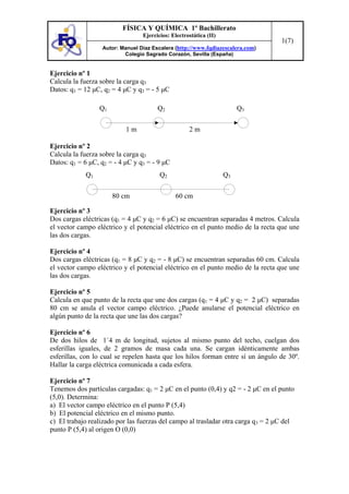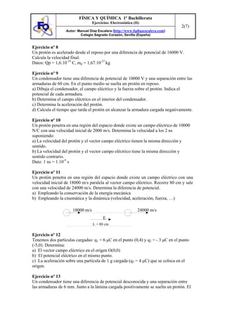El documento presenta 13 ejercicios de electrostática que involucran cálculos de fuerzas entre cargas eléctricas puntuales, campos eléctricos, potenciales eléctricos y aceleraciones sobre partículas cargadas. Los ejercicios abarcan temas como condensadores planos, movimiento de protones en campos eléctricos uniformes y sistemas de dos cargas puntuales. Se proveen las soluciones completas para cada uno de los ejercicios planteados.