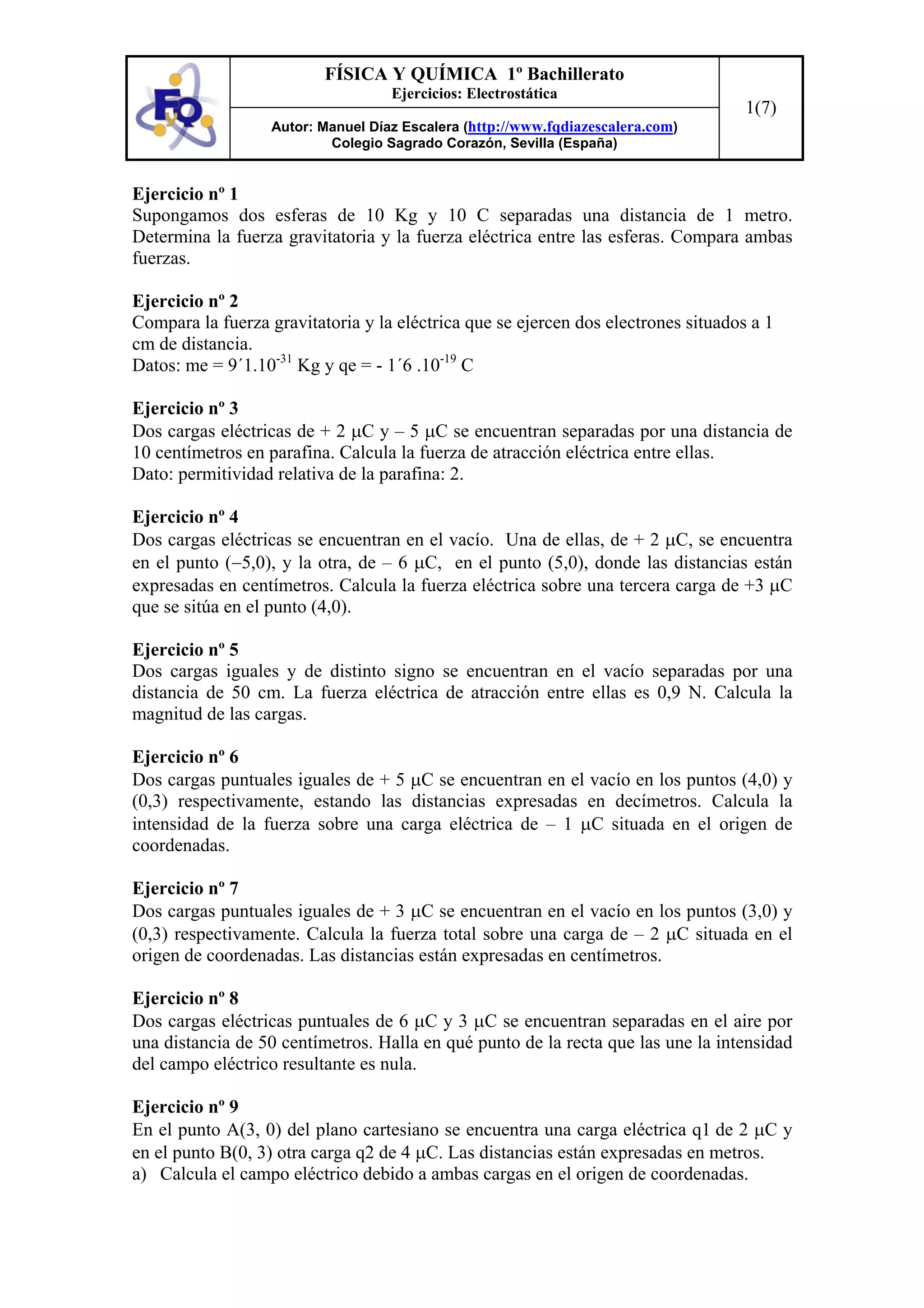 Este documento contiene 28 ejercicios de electrostática resueltos por Manuel Díaz Escalera. Los ejercicios cubren temas como fuerzas eléctricas y gravitatorias, campo eléctrico, potencial eléctrico, energía eléctrica y condensadores. Cada ejercicio presenta un problema diferente y su correspondiente solución.