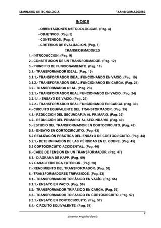 Este documento presenta un seminario sobre transformadores. Explica los objetivos y contenidos del seminario, incluyendo la introducción a transformadores, su constitución y funcionamiento, circuitos equivalentes, estudios de cortocircuito y conexiones trifásicas. También cubre temas como el acoplamiento en paralelo, características generales, protección y eficiencia energética de transformadores.