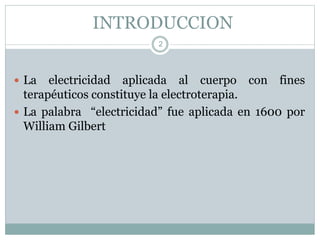 Este documento proporciona información sobre conceptos básicos de electricidad y electroterapia. Explica que la electricidad aplicada al cuerpo con fines terapéuticos constituye la electroterapia. Describe los tipos de corrientes eléctricas como la corriente directa, alterna e interferencial, y sus efectos fisiológicos. También cubre temas como electrodos, técnicas de aplicación, indicaciones y contraindicaciones de diferentes corrientes eléctricas utilizadas en electroterapia.