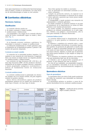 El documento describe diferentes tipos de corrientes eléctricas y su uso en electroterapia. 1) Las corrientes pueden ser unidireccionales o bidireccionales, continuas o variables. Las corrientes bidireccionales son más seguras y efectivas para la electroestimulación. 2) La electroestimulación excitomotriz se usa para facilitar la circulación, recuperación muscular y relajación usando corrientes de muy baja frecuencia, o para fortalecimiento muscular usando corrientes de baja frecuencia. 3) La electroestimulación analg