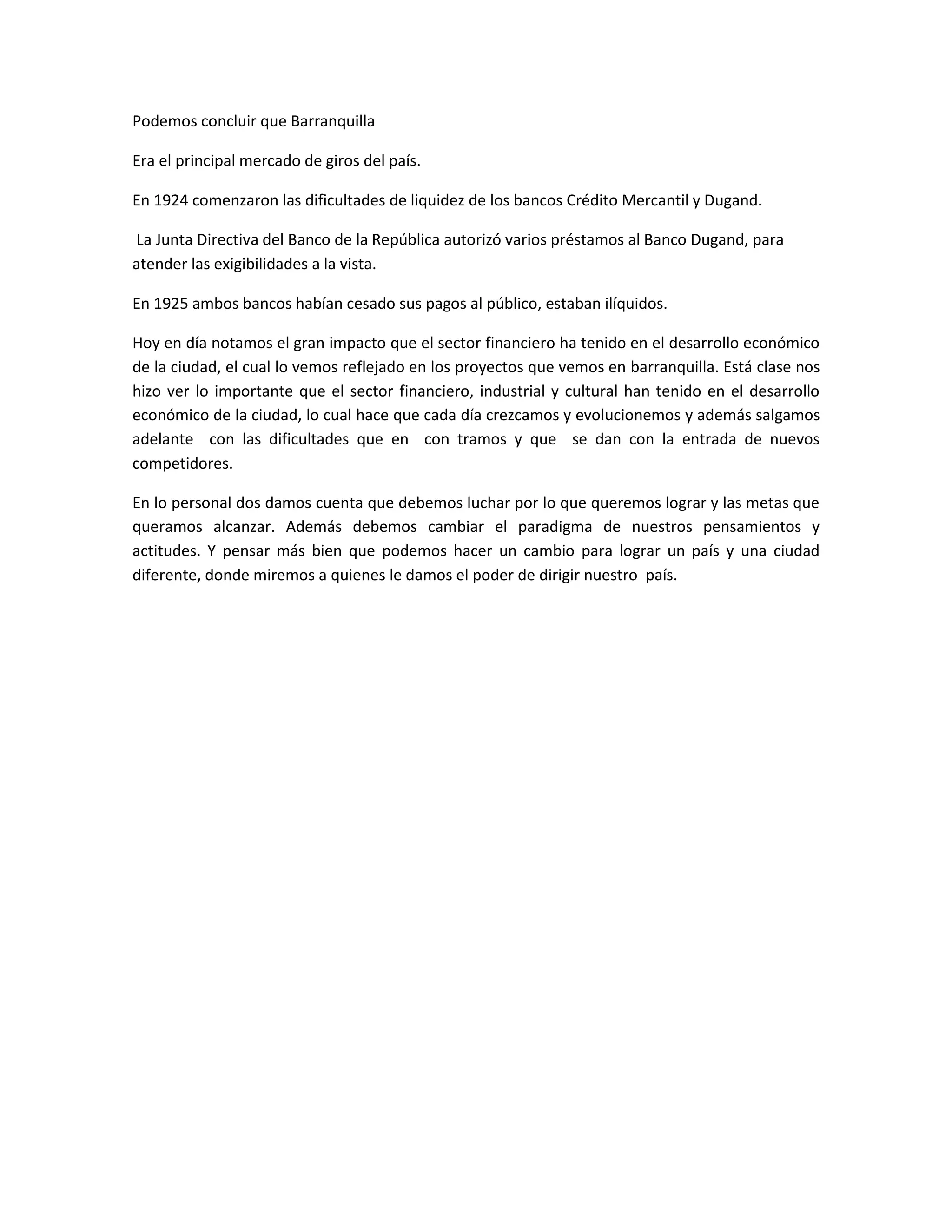 El documento describe las dificultades financieras que enfrentaron los bancos Crédito Mercantil y Dugand en Barranquilla en 1924-1925, lo que llevó a que dejaran de pagar al público y se volvieran ilíquidos, a pesar de préstamos de emergencia del Banco de la República. También discute el impacto del sector financiero en el desarrollo económico posterior de Barranquilla.
