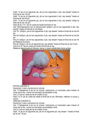 Este documento proporciona instrucciones detalladas para tejer un elefante de amigurumi utilizando ganchillo. Incluye instrucciones para el cuerpo del elefante, patas, orejas y ojos. Se requieren materiales como lana, agujas de ganchillo y hilo para coser. El cuerpo se teje en vueltas continuas aumentando el número de puntos hasta la mitad y luego disminuyendo, y las demás partes siguen un patrón similar de aumentos y disminuciones. Al final, todas las partes se cosen al c