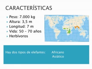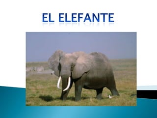 Este documento describe las características de los elefantes africanos y asiáticos, incluyendo su peso, altura, longitud de vida y dieta herbívora. Los elefantes africanos son más grandes y viven en el centro y sur de África, mientras que los elefantes asiáticos son más pequeños y viven en el sudeste de Asia. Ambos usan sus trompas para agarrar objetos y comida, y tienen colmillos de marfil de casi 1 metro de largo.
