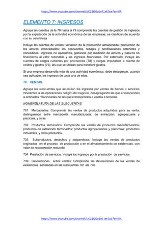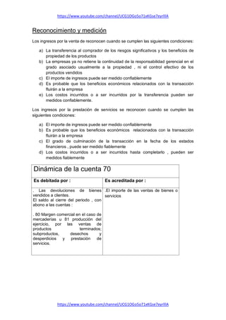 El documento detalla la clasificación y reconocimiento de las cuentas de ingresos en la contabilidad empresarial. Se explican las cuentas específicas relacionadas con ventas, variaciones de producción almacenada, y producción de activos inmovilizados, entre otros, así como los criterios para su medición y registro contable. Además, incluye ejemplos prácticos de cómo registrar estas transacciones contables.