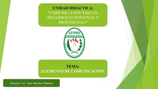 Este documento define los elementos clave de la comunicación, incluyendo el emisor, receptor, código, mensaje, canal de comunicación, ruido y retroalimentación. Explica que la comunicación implica la transmisión de un mensaje del emisor al receptor a través de un canal, y que la retroalimentación permite al emisor verificar la comprensión del mensaje.