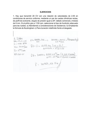 Este documento contiene 7 ejercicios de diseño de engranajes. Cada ejercicio presenta una situación de transmisión de potencia mecánica mediante engranajes y solicita calcular parámetros como la potencia transmitida, carga dinámica, esfuerzos, módulo, diámetros y materiales apropiados para los engranajes. Los cálculos se basan en fórmulas como la de Buckingham y consideran factores como la velocidad de giro, relación de velocidades, potencia, servicio y materiales de los engranajes.