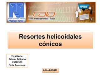 El documento describe los resortes helicoidales cónicos, incluyendo sus tipos de terminaciones y características de compresión. Expone sus principales usos en mecanismos, como mantener presión en válvulas y proporcionar flexibilidad en suspensiones. Además, detalla los materiales utilizados para su fabricación y menciona los muelles de torsión como un tipo específico para resistir fuerzas de rotación.