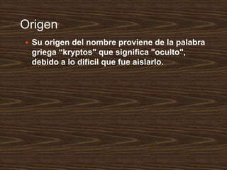 El kriptón es un gas noble descubierto en 1898 por Ramsay y Travers al evaporar aire líquido. Es incoloro, insípido y se encuentra en pequeñas cantidades en la atmósfera. Se utiliza para llenar vidrios dobles y mejorar su aislamiento térmico y acústico, así como en lámparas y flashes debido a su color rojo anaranjado característico. Aunque no es tóxico, su inhalación en altas concentraciones puede causar mareos, náuseas y la muerte por asfixia.