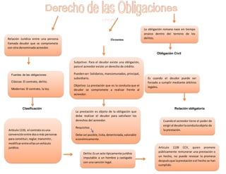 La obligación civil es una relación jurídica entre un deudor que se compromete a realizar una prestación y un acreedor con derecho a exigir dicha prestación. Surge de fuentes como contratos o delitos, y requiere que la prestación sea posible, lícita, determinada y valuada económicamente. El deudor está obligado a cumplir la prestación y el acreedor puede exigir su cumplimiento mediante arbitraje legal.