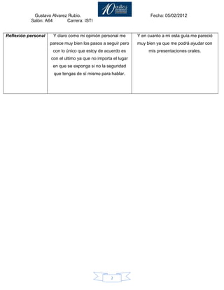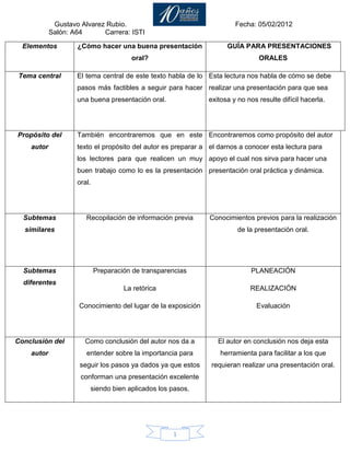 Este documento proporciona una guía para realizar presentaciones orales exitosas en 3 pasos: 1) preparar información previa y conocimientos sobre el tema, 2) planear la presentación y preparar transparencias, y 3) realizar la presentación evaluando el lugar y seguridad al hablar. El autor provee esta guía para apoyar a los lectores en la realización de presentaciones orales prácticas y dinámicas.
