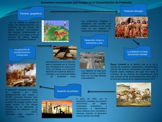 Este documento describe varios elementos estructurales y coyunturales que inciden en la concentración de población y la tasa de desempleo en Venezuela. Entre los elementos estructurales se encuentran factores geográficos, la localización de la industria, el desarrollo del petróleo y la política de desconcentración urbana. Los elementos coyunturales incluyen precios altos del petróleo, gastos públicos elevados y la descentralización de proyectos socio-productivos. También analiza cómo la injerencia del estado, la