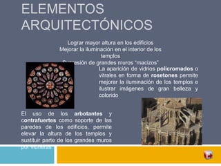 El documento describe los principales elementos arquitectónicos de las catedrales góticas, como el uso de vitrales, contrafuertes y arbotantes para mejorar la iluminación y elevar la altura de los edificios, la planta de cruz latina, la bóveda de crucería soportada por pilares, y presenta información sobre las catedrales góticas más importantes de Europa como Notre Dame de París, las catedrales de Toledo, Burgos, León, Barcelona y Girona, y la Catedral de Palma de Mallorca.