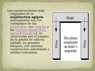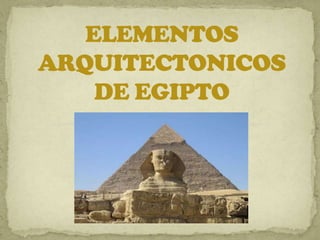 Los templos egipcios estaban compuestos de varios elementos arquitectónicos clave. Incluían una avenida procesional o "dromos", una entrada monumental o "pilono", obeliscos frente al pilono, un patio descubierto o "hipetro", y una sala con columnas llamada "sala hipóstila". Dentro del templo había cámaras más pequeñas como el santuario sagrado. Los templos egipcios se construyeron principalmente con piedra, ladrillo de adobe y madera importada.