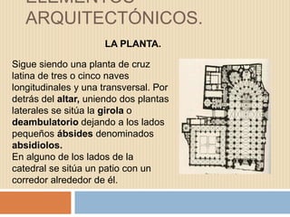 El documento describe los principales elementos arquitectónicos del estilo gótico como la introducción del arco apuntado y la bóveda de crucería, que permitieron elevar la altura de los edificios y mejorar la iluminación interior. También resume brevemente algunas de las catedrales góticas más importantes de España, como las de Toledo, Burgos, León, Barcelona y Palma de Mallorca.