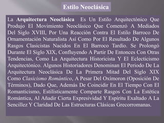 El documento describe diferentes estilos arquitectónicos como la arquitectura neoclásica, neogótica y exótica. La arquitectura neoclásica se caracteriza por la simetría, frontones y columnas de orden corintio. El estilo neogótico se distingue por la verticalidad, arcos ojivales y ornamentación. El estilo exótico incorpora elementos de otras culturas como cúpulas bulbosas y decoraciones orientales.