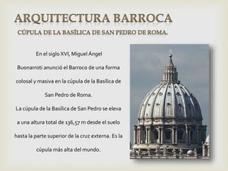 El documento describe varios elementos característicos del estilo barroco en la arquitectura. Miguel Ángel anunció el Barroco con la colosal cúpula de la Basílica de San Pedro en Roma. Las ciudades barrocas se enfocaron en puntos focales como obeliscos y cúpulas para subrayar su dinámica visión abierta. El Palacio del Luxemburgo en París utilizó pabellones angulares para salas principales en cada piso a diferencia de otros edificios de la época. Finalmente,