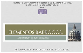 Este documento resume los principales elementos arquitectónicos, pictóricos y escultóricos del estilo barroco. Describe características como el uso de columnas salomónicas, cúpulas, frontones y arcos de medio punto en edificios como Vaux-le-Vicomte y la Misión de Tancoyol. En pintura, destaca el uso de líneas de profundidad, contrastes de luz y sombra y rostros expresivos en obras como Las Meninas y El entierro de la Virgen. En escultura, resalta