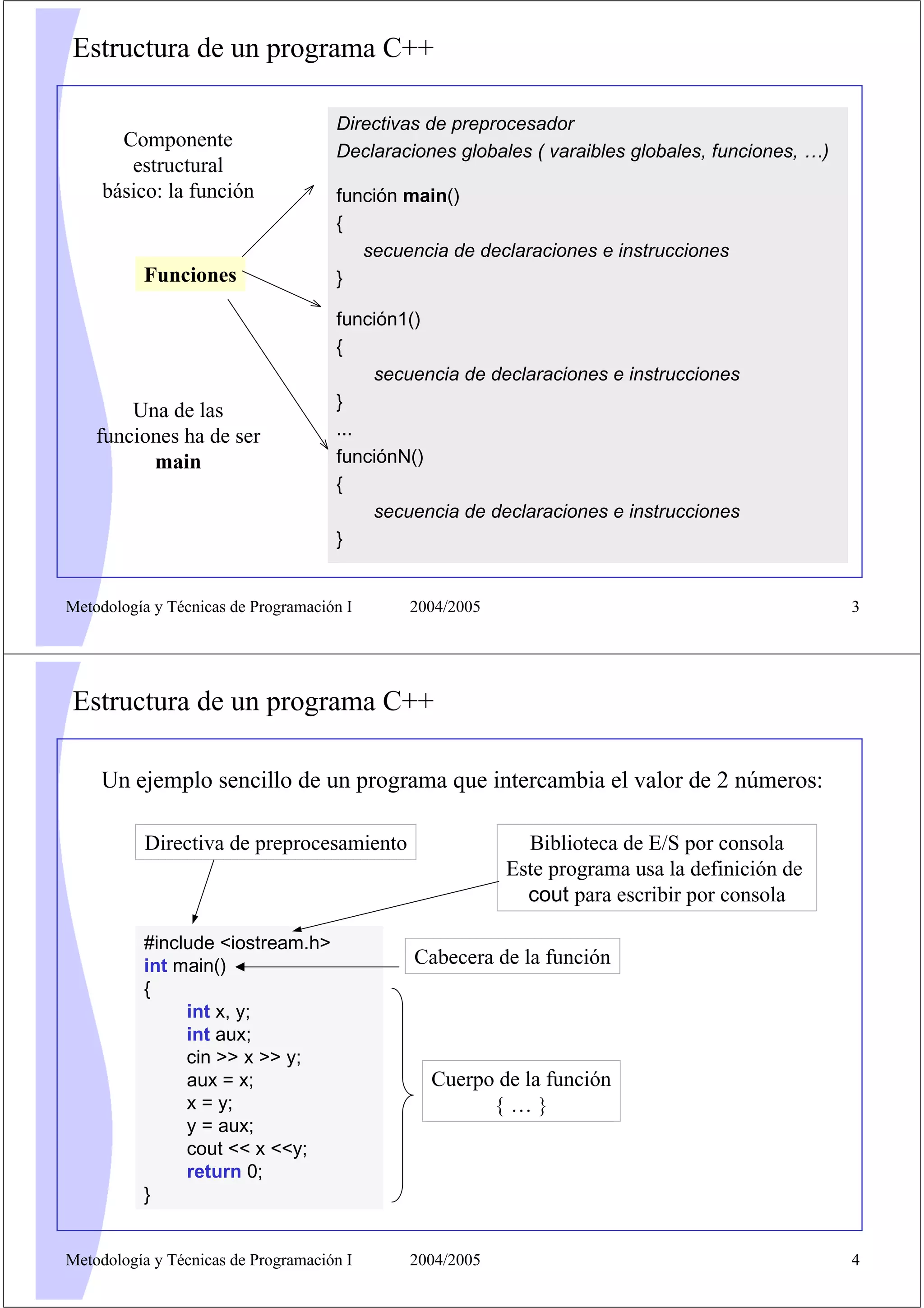 Este documento describe los elementos básicos de un lenguaje de programación C++. Explica la estructura básica de un programa C++, incluyendo las directivas de preprocesador, la función principal main(), comentarios y llamadas a funciones. También describe los tipos de datos simples en C++ como enteros, reales, caracteres y lógicos, así como sus operaciones y funciones asociadas.
