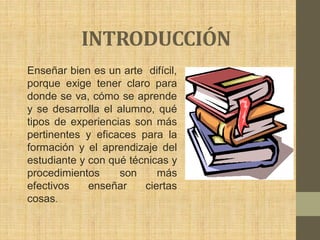 El documento describe los elementos básicos de un currículo educativo. Explica que los objetivos definen lo que se quiere lograr, los contenidos lo que se enseñará, y la metodología cómo se enseñará. También cubre la importancia de la evaluación para mejorar el proceso de enseñanza y aprendizaje.