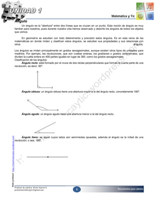 El documento describe los elementos básicos de la geometría plana, incluyendo el punto, la recta, el plano, el segmento, el ángulo y el triángulo. Define cada uno y explica sus características fundamentales, como que un punto es adimensional, una recta contiene infinitos puntos, un plano tiene dos dimensiones, un segmento es una parte de una recta, un ángulo mide la apertura entre dos líneas y un triángulo tiene tres lados y tres vértices.