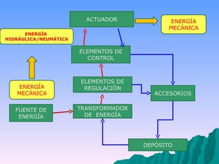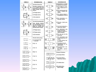 Este documento presenta los elementos básicos de un circuito neumático, incluyendo la fuente de energía (compresor), elementos de control (válvulas), elementos de regulación (actuadores neumáticos), y accesorios (conductos, uniones). Explica que estos circuitos se representan mediante diagramas normalizados para estandarizar la lógica de los elementos. Finalmente, detalla algunos ejemplos prácticos de circuitos neumáticos para controlar actuadores.