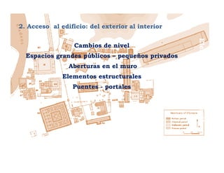 El documento describe los diferentes elementos de circulación en un edificio y cómo estos afectan la aproximación, acceso y configuración del recorrido dentro del edificio. Se discuten conceptos como cambios de nivel, espacios públicos vs privados, formas de recorrido lineales, radiales o en espiral, y cómo la circulación se relaciona con los espacios internos del edificio. Finalmente, se mencionan escaleras, pasillos y ascensores como formas comunes del espacio de circulación.