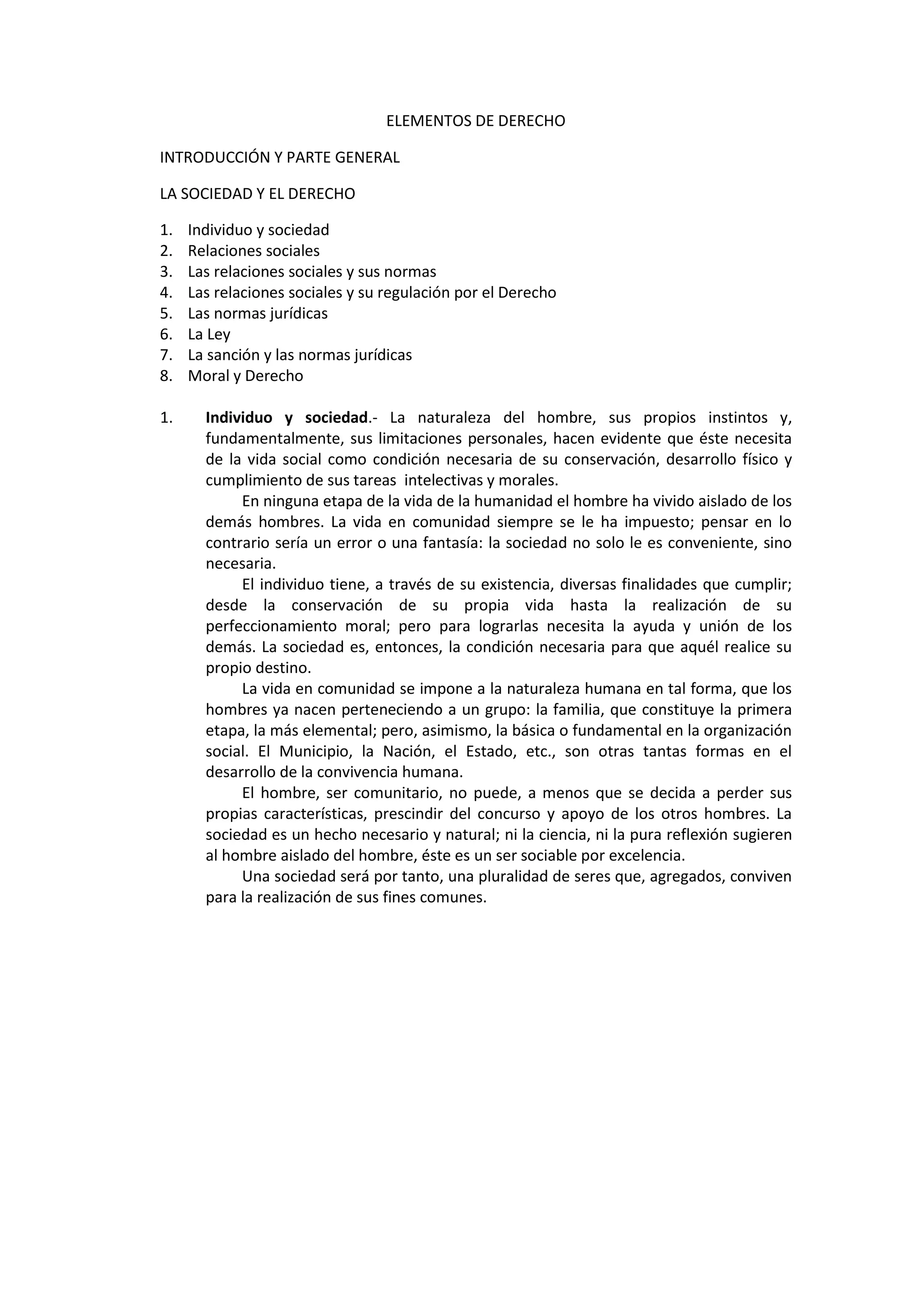 Este documento introduce los conceptos fundamentales de la sociedad y el derecho. Explica que los individuos viven en sociedad para lograr fines que no pueden alcanzar por sí mismos. Esto genera relaciones sociales que deben regularse para mantener el orden y evitar conflictos. El derecho sirve para organizar y coordinar la conducta social a través de normas jurídicas, permitiendo la convivencia ordenada y el progreso de la sociedad.