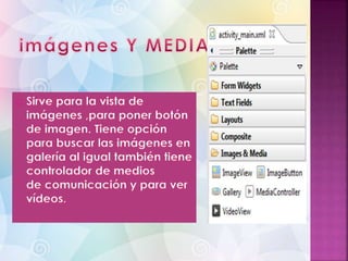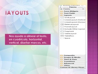 Este documento describe la interfaz de usuario de un editor de código. Incluye una lista de comandos y herramientas como "Editar", "Archivo", "Ejecutar", "Depurar" y "Ayuda". También describe parámetros para diseñar la interfaz como "Relleno izquierdo", "Parte superior del diseño" y "Contenido de la descripción". La estudiante expresa que el tema de desarrollo de aplicaciones móviles es interesante pero complicado de entender sin una explicación adecuada.