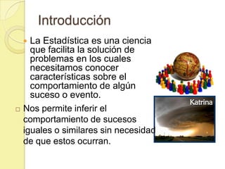 Este documento presenta conceptos básicos de estadística descriptiva como población, muestra, variable, dato, escalas de medición, tablas de frecuencia y métodos de ordenamiento de datos. Explica que la estadística descriptiva se encarga de recolectar, organizar y analizar datos para obtener conclusiones sobre una población. También define conceptos como variable, dato, escalas de medición y métodos para ordenar y tabular datos como listas ordenadas, método de tallo y hojas y tablas de frecuencia.