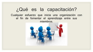 Este documento describe los elementos clave de la capacitación, incluyendo su definición, las cuatro fases principales (evaluación de necesidades, diseño, implementación y evaluación), y los componentes de cada fase. La capacitación es cualquier esfuerzo que inicia una organización para fomentar el aprendizaje entre sus miembros. Las cuatro fases son evaluación de necesidades, diseño, implementación y evaluación.