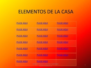 El documento presenta una lista de los elementos básicos que componen una casa, incluyendo muebles como mesa, cama y sillones; electrodomésticos como nevera, microondas y lavadora; elementos sanitarios como inodoro y lavamanos; y otros como ventana, bombillos, cortinas y puerta.