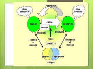 La comunicación es el proceso mediante el cual se transmite información de un emisor a un receptor. Existen dos tipos principales de comunicación: oral y escrita. La comunicación oral utiliza el canal auditivo y permite interacción en tiempo real, mientras que la comunicación escrita se percibe a través de la vista y permite una elaboración más detallada. El proceso de comunicación implica un emisor, receptor, mensaje, canal, retroalimentación, codificación y decodificación. Existen también barreras ambientales, verbales e interpersonales que pueden interferir con