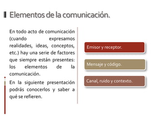 El documento presenta los elementos de la comunicación, incluyendo emisor, receptor, mensaje, código, canal, ruido y contexto. Describe cómo cada elemento interactúa para facilitar o dificultar el acto comunicativo. También incluye una actividad final que invita a aplicar estos conceptos en un ejercicio práctico.