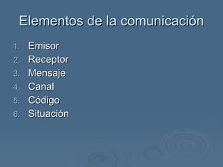 El documento habla sobre los elementos de la comunicación involucrados en transmitir un mensaje sobre la escasez del agua. Identifica al emisor como un especialista, al receptor como consumidores, y el mensaje trata sobre la escasez del agua. El canal utilizado es un monográfico en internet y el código es la lengua castellana escrita. La situación es exponer una situación crítica relacionada con el agua.