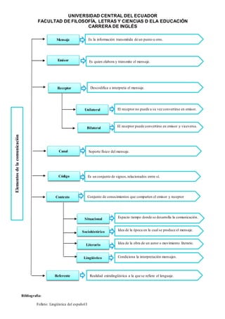 Este documento presenta información sobre los elementos que intervienen en la comunicación. Brevemente describe que la comunicación implica la transmisión de información de un emisor a un receptor a través de un canal y código. Además, identifica los elementos clave de la comunicación como el mensaje, emisor, receptor, canal, código, contexto y referente.