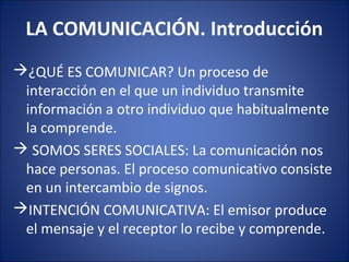 El documento habla sobre la comunicación y sus elementos. Explica que la comunicación implica la transmisión de información de un emisor a un receptor. Identifica los elementos clave de la comunicación como el emisor, receptor, mensaje, canal, código y contexto. También describe los tipos de signos como indicios, iconos y símbolos, y las propiedades del signo lingüístico como la arbitrariedad y la doble articulación. Por último, explica las funciones del lenguaje como la función emotiva, conativa, referencial, poética, fática y