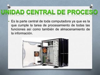 La placa madre es el componente central de una computadora que procesa y almacena información. Contiene el microprocesador, memoria RAM, memoria caché y otros componentes como la fuente de poder, disco duro, tarjetas gráficas y de sonido que permiten que la computadora funcione.