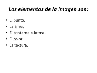Los principales elementos de la imagen son el punto, la línea, el color, la textura y la forma. El punto puede ser un elemento único que atrae la atención o un elemento constitutivo de una imagen. La línea puede ser recta, curva o diagonal e influye en la percepción de equilibrio. El color se divide en cálidos como el rojo y fríos como el azul. La textura describe las superficies tanto naturales como artificiales. La forma se crea cuando una línea se cierra formando un contorno.