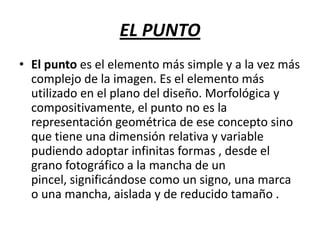 Este documento describe diferentes elementos visuales básicos como puntos, líneas, formas, colores, texturas e iluminación. Explica los diferentes tipos de cada elemento, incluyendo puntos como elementos únicos o constitutivos, líneas rectas, curvas, diagonales y formas como contornos. También describe colores cálidos y fríos, tipos de luz como cálida y fría, e iluminación como frontal, lateral y cenital.