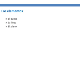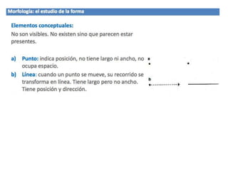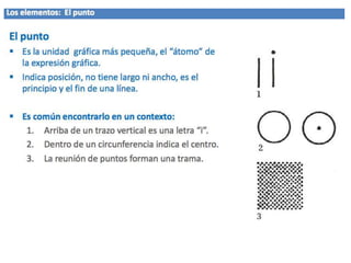 Este documento describe las características principales del punto, la línea y las formas básicas como elementos gráficos. Explica que el punto es la unidad mínima e irreductible y que varios puntos juntos pueden definir contornos o formas. Describe las cualidades de la línea como dinámica, con capacidad de dirección y expresividad. Finalmente, analiza las formas básicas del círculo, cuadrado y triángulo equilátero y sus significados y propiedades.