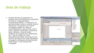 El documento describe los elementos de la interfaz de Flash, incluyendo el escenario, la línea de tiempo y la barra de menús, que permiten gestionar y crear animaciones. Se detalla la función de diferentes menús, paneles y herramientas para realizar dibujos, modificar objetos y controlar la reproducción de la animación. También se menciona la importancia de las capas para organizar el contenido y la utilización del panel de propiedades para modificar instancias de símbolos sin alterar el original.