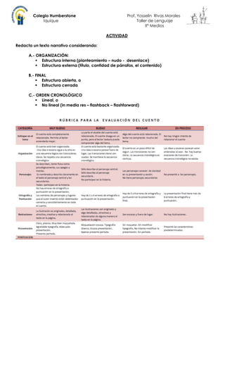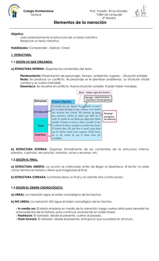 El documento presenta los elementos estructurales de un texto narrativo. Explica que una narrativa puede organizarse internamente con un planteamiento, nudo y desenlace, y externamente en párrafos o capítulos. El final puede ser abierto o cerrado, y el orden cronológico puede seguirse de forma lineal o no lineal usando técnicas como in media res, flashback o flashforward. Los estudiantes deben redactar un texto narrativo considerando estas opciones de organización, final y orden de los hechos.