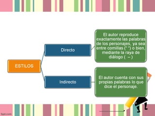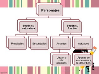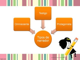 Este documento describe los diferentes elementos de la narrativa, incluyendo el narrador (ya sea omnisciente, testigo o protagonista), el código apreciativo, los registros del habla y los espacios.