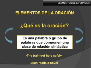 Este documento presenta los elementos básicos de la oración, incluyendo sujeto, predicado, y diferentes tipos de oraciones como simples, compuestas, complejas y compuestas-complejas. Explica que el sujeto es quien o qué realiza la acción en la oración, mientras que el predicado es lo que se dice sobre el sujeto. Luego proporciona ejemplos para ilustrar estos conceptos y concluye con ejercicios prácticos para identificar los tipos de oraciones.