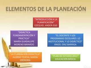 Este documento presenta información sobre varios libros y documentos relacionados con la planificación educativa. Resume los autores y temas clave de "Introducción a la planificación" de Ezequiel Ander-Egg, "El docente y los programas escolares" de Ángel Díaz Barriga, el "Plan de estudios 2011 de educación básica", "Didáctica: fundamentación y práctica" de María Guadalupe Moreno Bayardo, y "La planeación didáctica" de María Eréndira Tejeda.