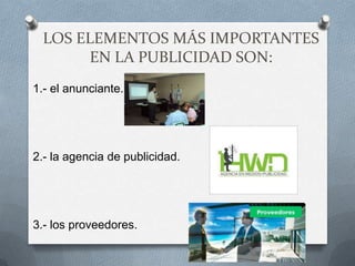 Los tres elementos más importantes en la publicidad son el anunciante, la agencia de publicidad y los proveedores. El anunciante puede ser fabricantes, revendedores, personas físicas o instituciones. Las agencias de publicidad pueden ser internas, formando parte de la compañía anunciante, o externas e independientes que ofrecen sus servicios a clientes.